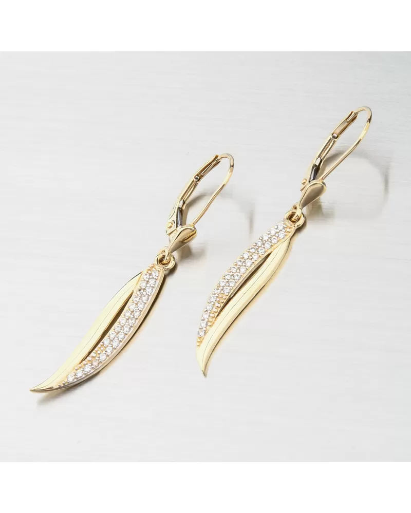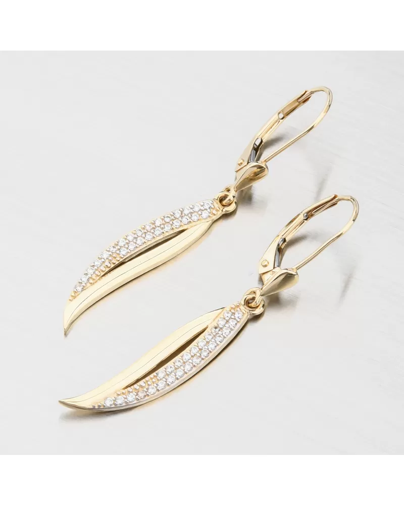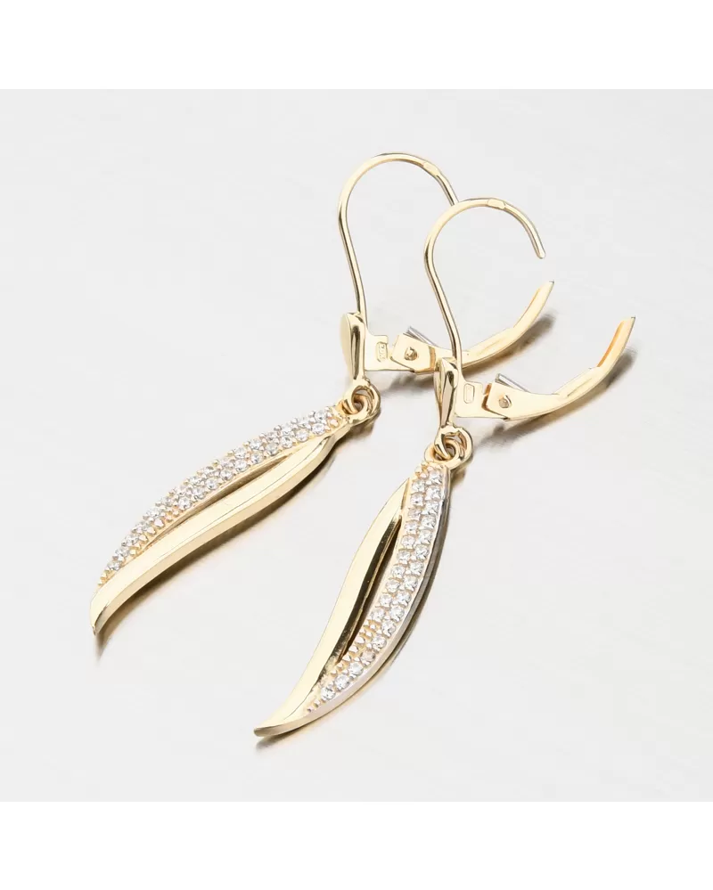 Nádherné visací zlaté náušnice, které zaujmou precizním provedením a kvalitním zpracováním. Náušnice mají visací ozdobu ve tvaru lístku, kde užší část je vysokém lesku a širší část je osazena dvěma řadami zářivých zirkonů. Zirkony jsou briliantového brusu, který propůjčuje zirkonům brilanci pravých diamantů, který podpoří i konstrukce náušnic. Konstrukce je navržena tak aby dokonale prostupovalo světlo kolem zirkonů.