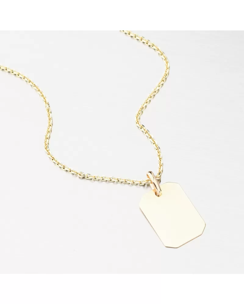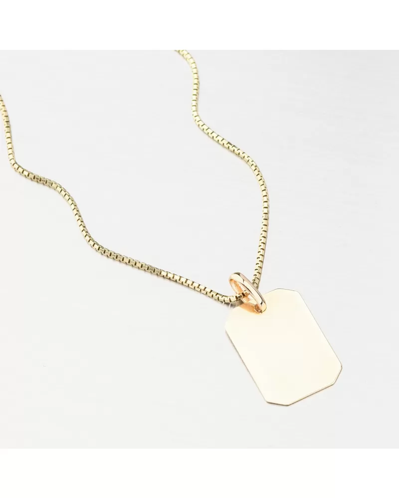 Jednoduchý zlatý přívěsek ve tvaru destičky ve vysokém lesku. Na přívěsek je možné nechat z obou stran udělat rytinu. Např. jméno, datum, věnování. Přívěsek s rytinou se hodí jako perfektní dárek pro Vaše milované. Detaily prosím uveďte do kolonky "rytina".