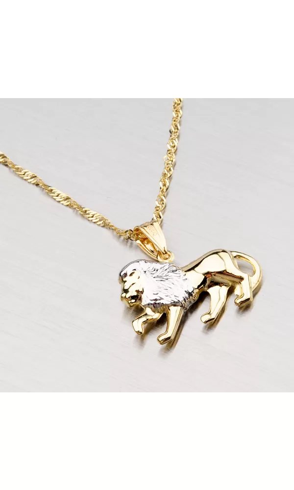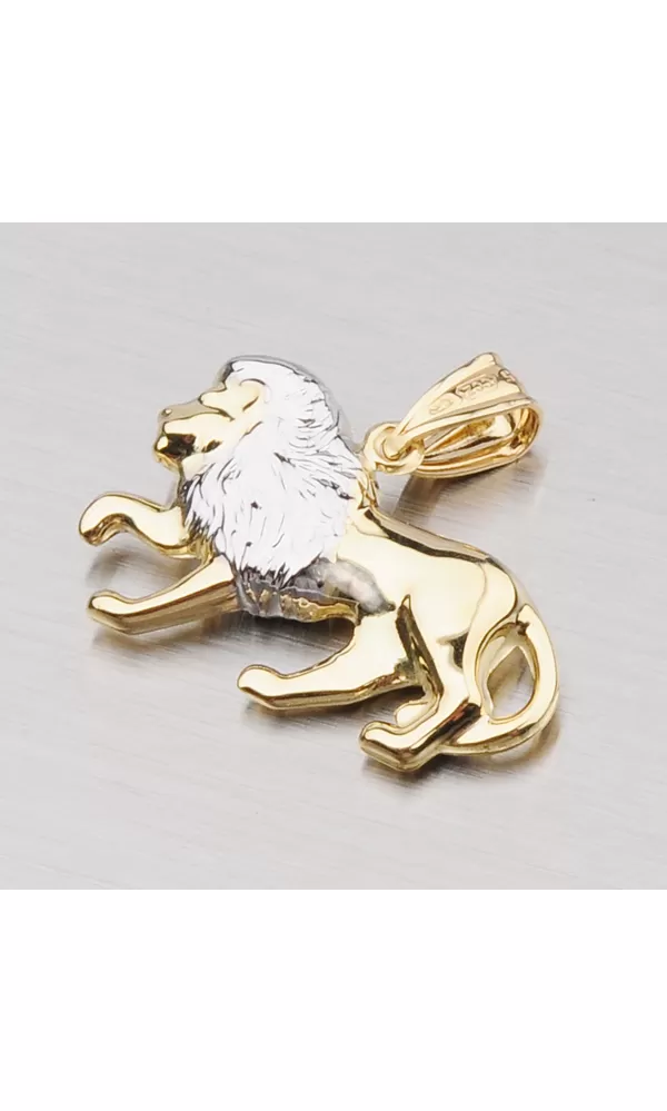 Zlatý přívěsek ve znamení Lva vyrobený v kombinaci žlutého a bílého čtrnáctikarátového zlata 585/1000 v lesklé povrchové úpravě. Na doplňující fotografii je přívěsek zavěsený na řetízku lambáda 304-0002.