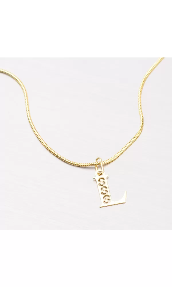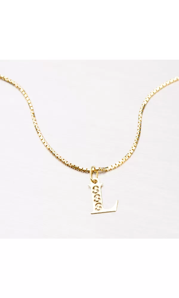 Přívěsek ve tvaru písmenka L je vyroben ze žlutého čtrnáctikarátového zlata 585/1000. Přívěsek je vyroben v lesklé povrchové úpravě s jemnými proseky. Na doplňujících fotografiích je přívěsek vidět na řetízku: 364-0100, 44-102844-1137