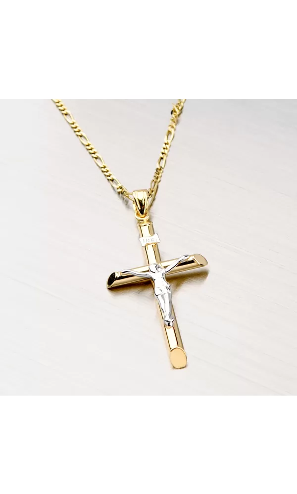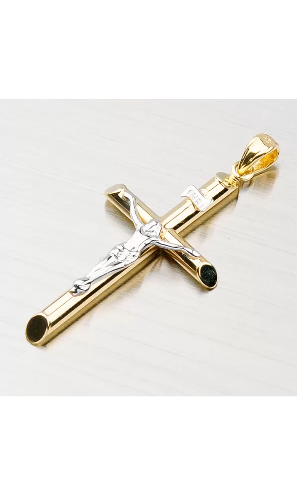 Přívěsek ve tvaru oblého kříže s Kristem je vyrobený ze čtrnácti-karátového zlata o ryzosti 585/1000 v kombinaci bílé a žluté barvy s lesklým povrchem. Nad Kristem se nachází pergamen s vyznačenými písmeny INRI. Přívěsek je detailně zpracovaný a zaručeně s ním upoutáte pozornost.