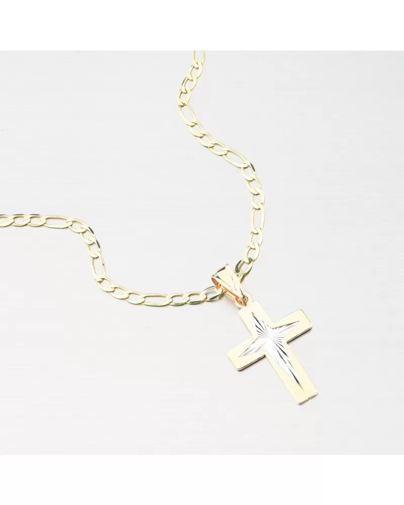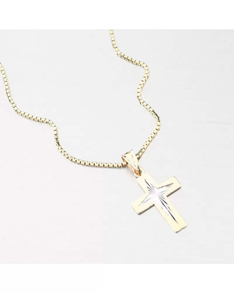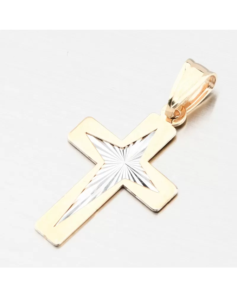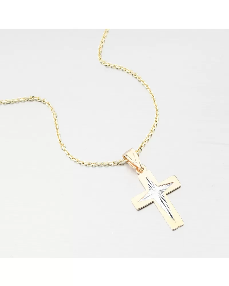 Tento zlatý přívěsek ve tvaru kříže spojuje klasickou symboliku víry s moderním designem, který zaujme svou jemností i leskem. Střed kříže je v bílé barvě zlata v lesklé povrchové úpravě, zvýrazněný precizním gravírováním ve tvaru hvězdy uprostřed. Každý paprsek světla se odráží jinak – připomíná vnitřní sílu, naději a světlo, které kříž symbolizuje.