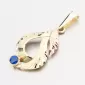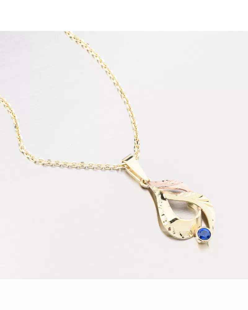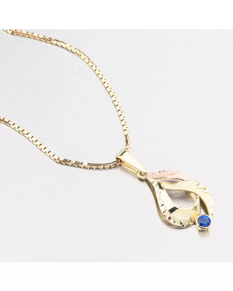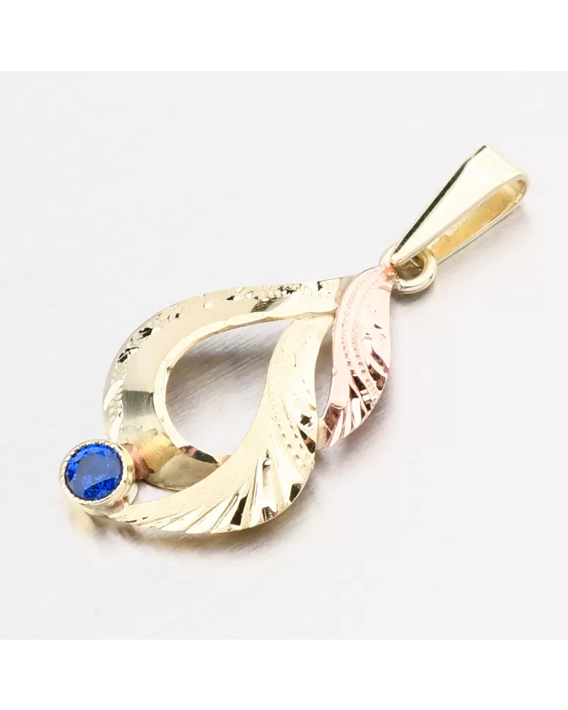 Přívěsek je vyrobený tradiční klenotnickou technikou a je bohatě zdobený ručním rytím. Přívěsek je ozdoben v dolní části zářivým syntetickým safírem v nádherné tmavě modré barvě. Je vybroušen brialintovým brusem, který zajišťuje maximální brilanci vybroušených facet, dokonale odráží světlo a neuvěřitelně září z každého úhlu pohledu.