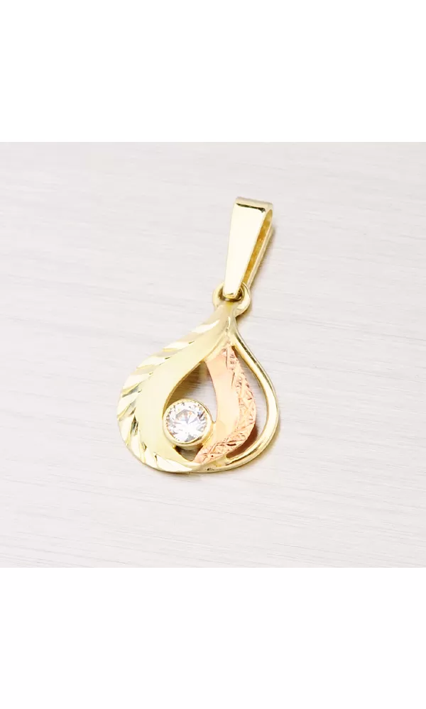 Propracovaný přívěsek je vyrobený tradiční klenotnickou technikou v kombinaci žlutého a červeného čtrnáctikarátového zlata 585/1000 v kombinaci lesklé a pískované povrchové úpravě. Přívěsek zdobí precizní ruční gravírování a bílý zirkon, který je umístěn ve spodní části přívěsku. Tento propracovaný kousek musíte mít. Bude se ve Vašem dekoltu krásně vyjímat.