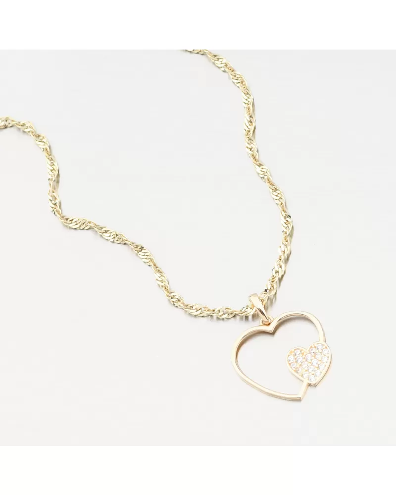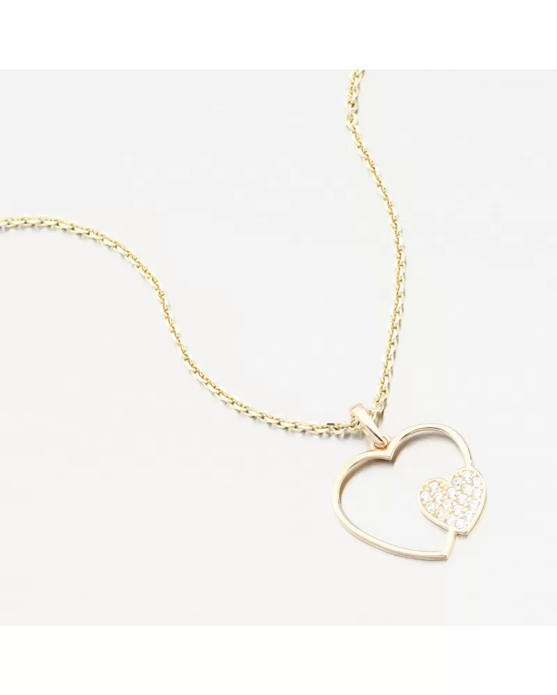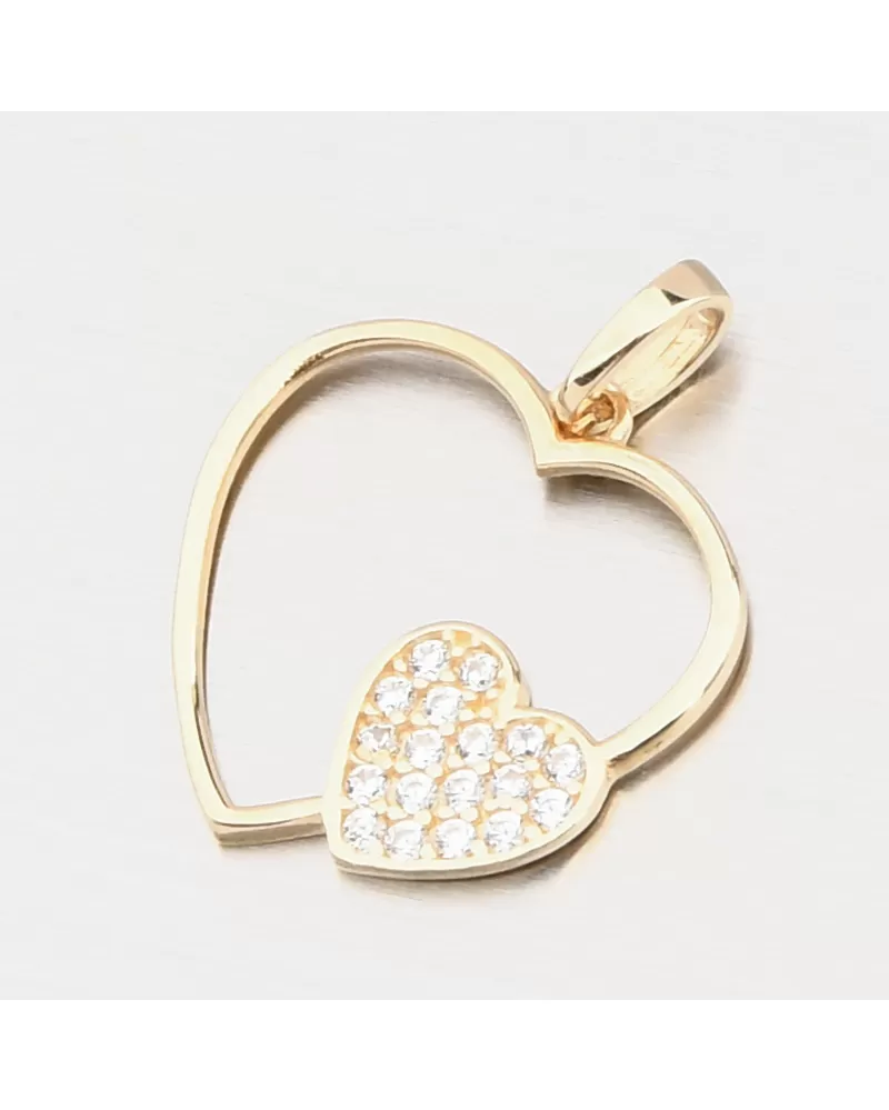 Tento jemný zlatý přívěsek ve tvaru srdce představuje dokonalou kombinaci jemnosti a luxusu. Lesk přívěsku krásně doplňuje třpyt drobných zirkonů, které zdobí drobné srdíčko vsazené na okraji hlavního srdce. Zirkony jsou briliantového brusu, který zajišťuje maximální brilanci vybroušených facet, dokonale odráží světlo a neuvěřitelně září z každého úhlu pohledu. Otevřený design srdce působí vzdušně a romanticky – ideální dárek pro vyjádření lásky či náklonnosti.