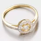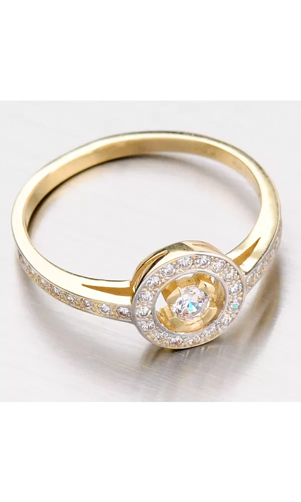 Tento krásný dámský prsten s kulatou ozdobou je vyrobený ze žlutého čtrnácti karátového zlata o ryzosti 585/1000 v lesklé povrchové úpravě. Prsten je zdoben zirkony v briliantovém brusu, které dodávají šperku vyjímečný lesk a brilanci.