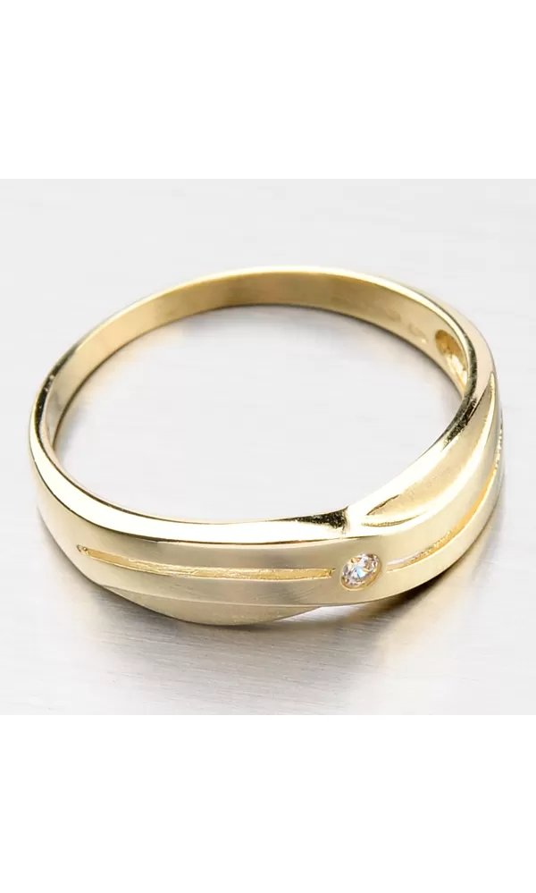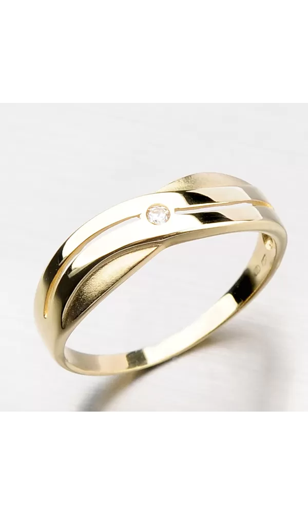 Krásný symetrický prsten je vyrobený ze žlutého čtrnácti karátového zlata o ryzosti 585/1000 s lesklou a matnou povrchovou úpravou. Prsten je osazen bílým zirkonem v briliantovém brusu, který dodává šperku výjimečný lesk a brilanci.