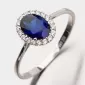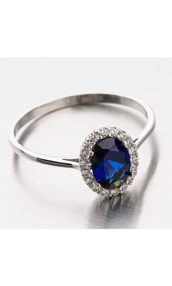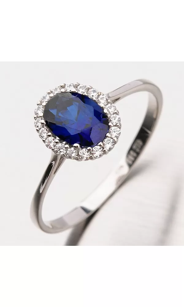 Rozmazlete se tímto skvostným prstenem, který zdobí velký syntetický safír oválného tvaru. Syntetický safír je zbroušen tak, aby vytvářel dokonalý třpyt. Kolem syntetického safíru jsou precizně vsazeny zirkony v briliantovém brusu. Tento krásný dámský prsten je vyrobený z bílého čtrnácti karátového zlata o ryzosti 585/1000 v lesklé povrchové úpravě Tento prsten uchvátí každou ženu a proto je to velmi dobrý tip na dárek.