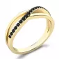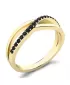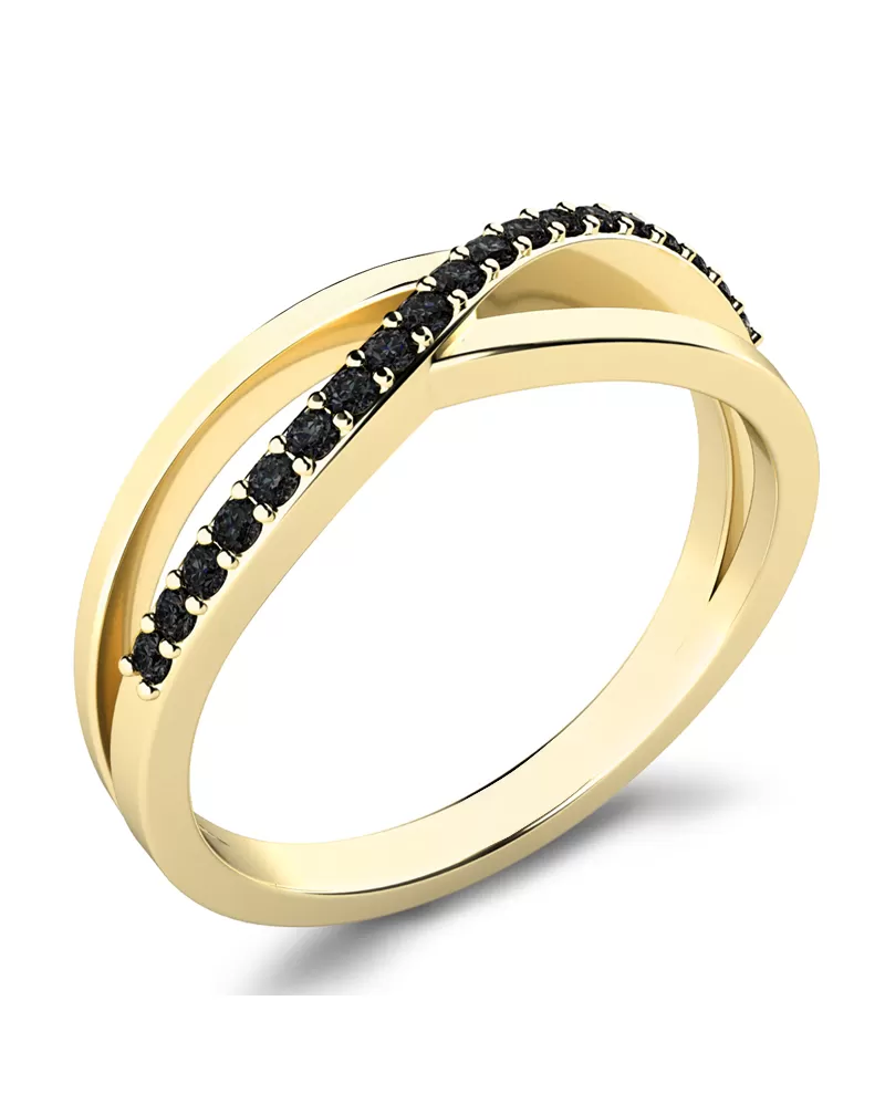 Prsten jednoduchého designu, kde propletená ozdoba plynule přechází v obroučku prstenu. Prsten je vyroben ze žlutého čtrnácti karátového zlata - 585/1000 v lesklé povrchové úpravě. V prstenu je vsazeno devatenáct kulatých diamantů černé barvy vybroušených kulatým briliantovým brusem. Vsazování diamantů provádějí naši nejzkušenější mistři zlatníci ručně pod mikroskopem s přesností na 0,01mm a proto nehrozí vypadnutí kamínků jako to bývá u strojně vyráběných prstenů.