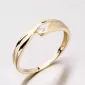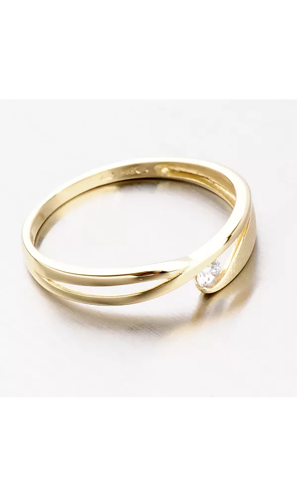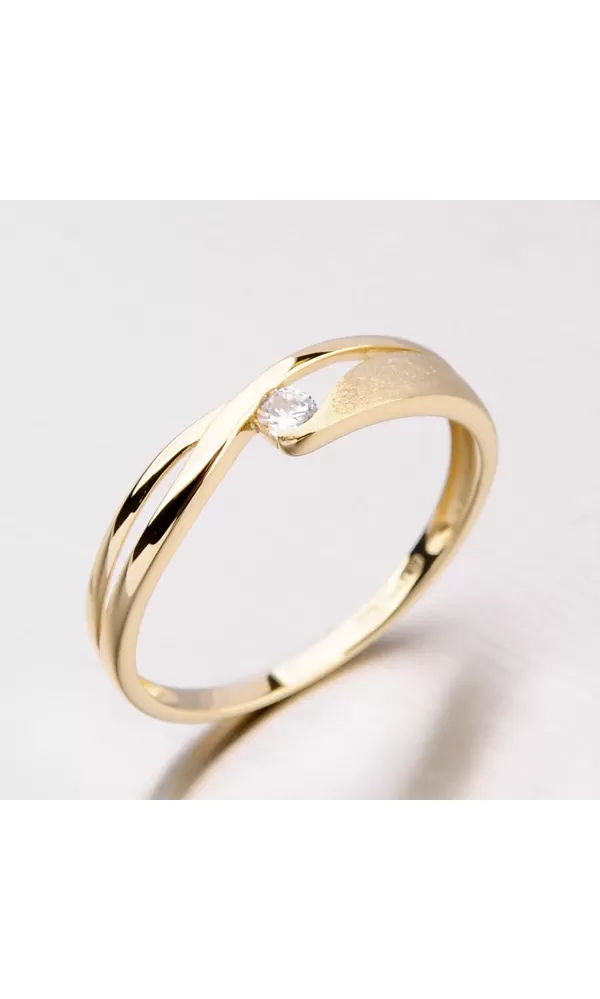 Dámský prsten s jedním bílým zirkonem je vyrobený ze žlutého čtrnácti karátového zlata o ryzosti 585/1000. Prsten je vyrobený v kombinaci lesklé a matné povrchové úpravě.