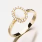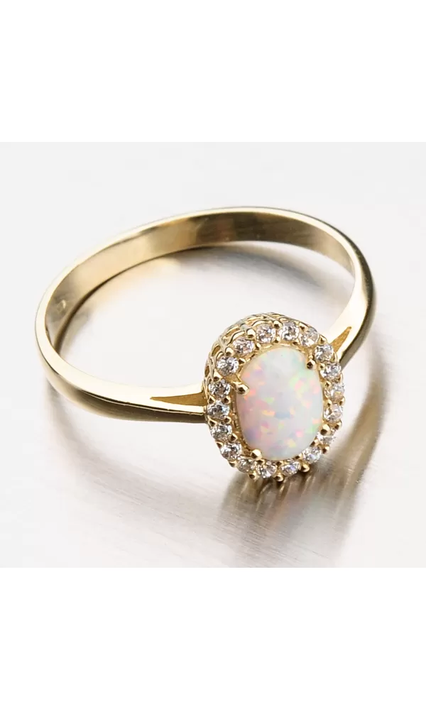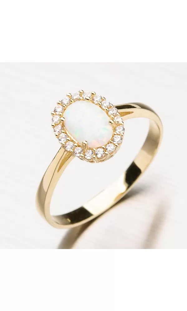 Tento krásný dámský prsten vyrobený ze žlutého čtrnácti karátového zlata o ryzosti 585/1000 v lesklé povrchové úpravě. V prstenu je vsazen nádherný oválný opál, který hraje všemi barvami. Kolem oválného opálu jsou precizně vsazeny zářivé zirkony v briliantovém brusu.