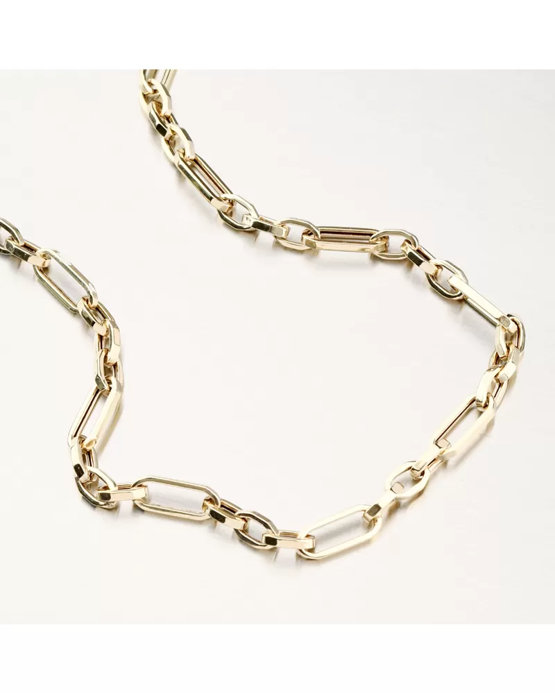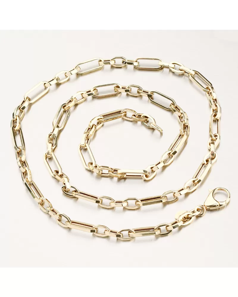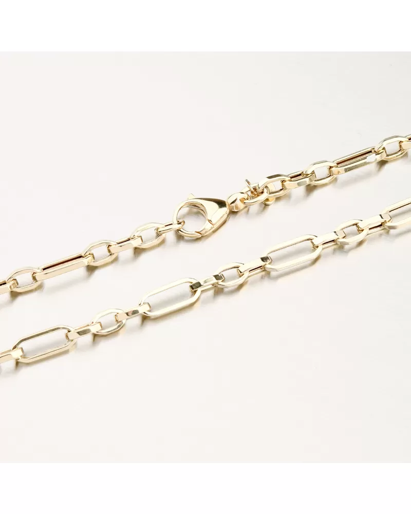 Tento nadčasový zlatý náhrdelník zaujme svým výrazným řetízkovým vzorem, který kombinuje moderní linkový design s klasickou elegancí. Precizně zpracované podlouhlé články vytvářejí harmonický rytmus a krásně odrážejí světlo při každém pohybu. Náhrdelník působí luxusně, přesto lehce a přirozeně — skvěle doplní jak každodenní outfit, tak výjimečnou večerní garderobu. Ideální volba pro ty, kteří hledají šperk s osobitým stylem a trvalou hodnotou.
