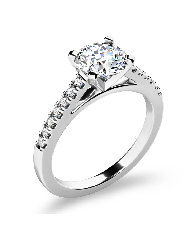 Zásnubní prsten je vyroben z bílého čtrnáctikarátového zlata - 585/1000 v lesklé povrchové úpravě. Prsten má jeden hlavní dominantní diamant kulatého briliantového brusu, který je uchycený do čtyřkrapnové korunky. Toto uchycení nechá diamant dokonale vyniknout v jeho kráse a brusu. Po stranách v obroučce prstenu je vsazeno na každé straně 7 zářivých diamantů, které prsten zjemňují. Všechny diamanty mají briliantový brus, který zajišťuje maximální brilanci vybroušených facet, dokonale odráží světlo a neuvěřitelné září z každého úhlu pohledu!